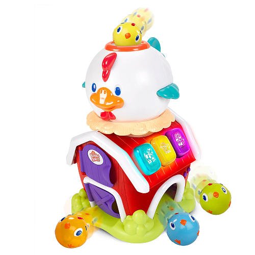 The Cluck and Learn Barn brings animal learning and ball drop surprise together to spark laugh out loud fun. Toddler can drop balls into the chicken to activate fun barnyard sounds, and to see which barn door they'll pop out of. Pressing the buttons teaches animal names and sounds while ball dropping fosters counting and playing all at the same time. Read moreReview Rating :